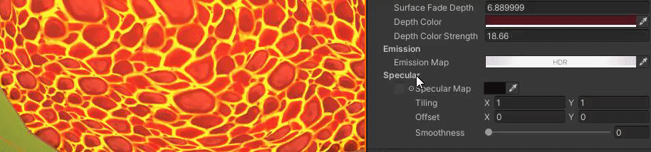Here is where you can alter the reflection and shininess of your liquid. A specular map and color controls the tint and strength of the reflection. Smoothness determines if the surface is rough/matte or smooth/polished.