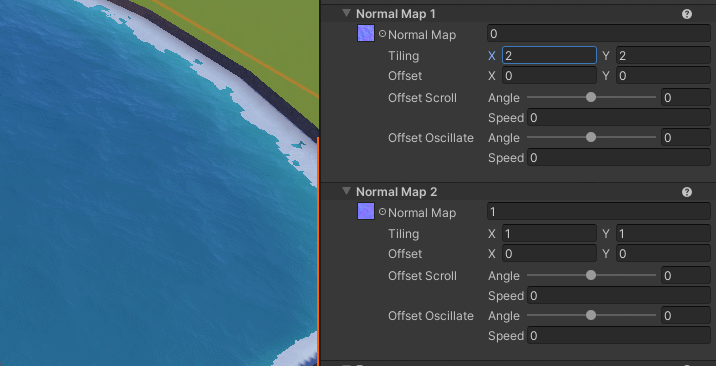 In this shader you get two normal map slots! You can control the strength, tiling, offset, angle, speed, and oscillation of each one to produce different effects. For example, for a river you could increase the speed and adjust the angle so it flows in the direction you want. Having two normal maps scrolling at different angles creates a nice layering effect!