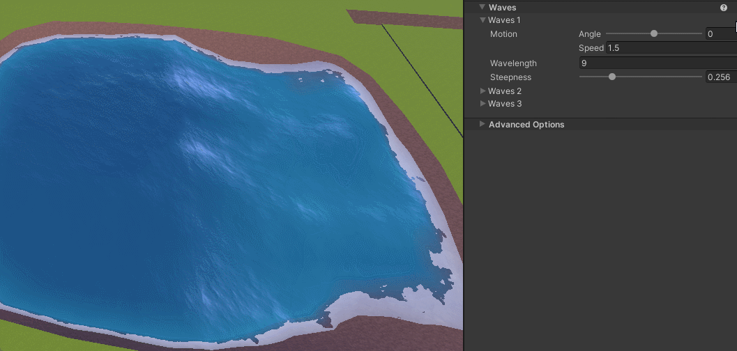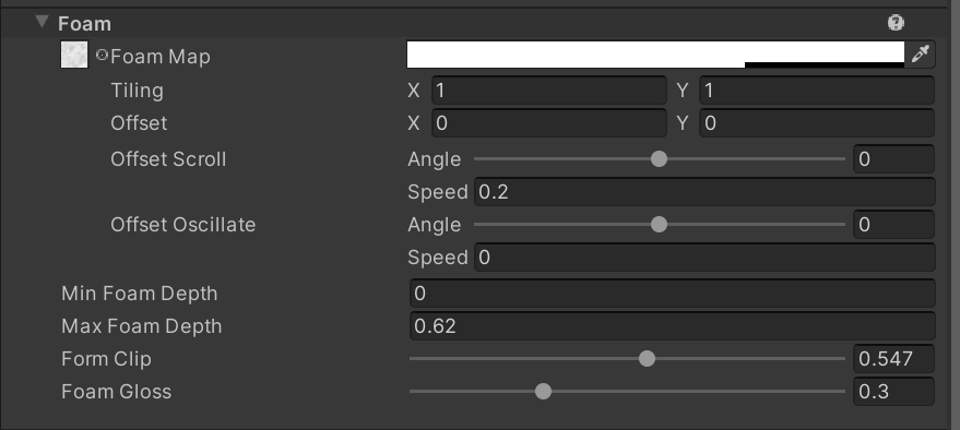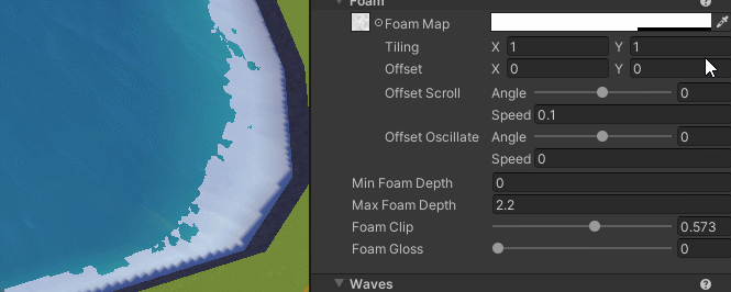 Foam is what gathers at the edges of your water and is generated automatically based on these settings on high-memory platforms. Whatever texture you use is put through a threshold filter to make a cutout which gives you your foam shape! You have the same amount of control for this as the base color and normal maps. There are some foam specific settings: