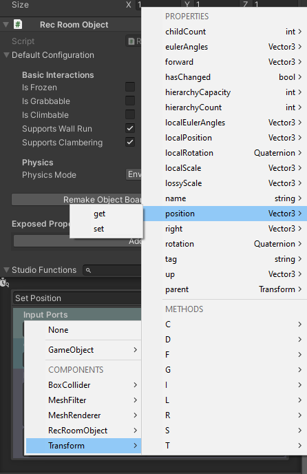 Studio Functions are a Rec Room Studio feature that enables you to author custom chips that call GameObject and Component methods on your Rec Room Objects.  Studio Functions support a wider variety of data types and can call C# methods with any number of parameters.  Studio Functions can also forward the return values from C# methods to other chips in your room’s Circuit graph.  Want to locally set the Position and Rotation of your object? You now can! Most GameObject and Component methods and properties are supported, so if there’s one you’d like to know more about, you can look it up here