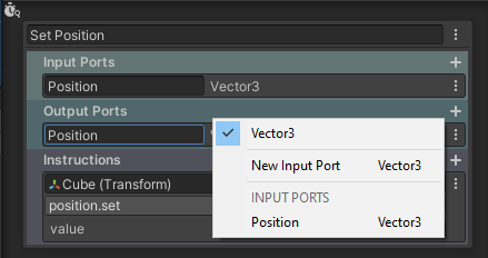In this example, I’ll be creating a function to set the position of my cube. To do this, I need to have a Vector3 input port so that I can use Vector chips in-game to control the position of my cube. If you want to change type, you’ll need to remove the port and add a new one. To remove one, click the 3 dots next to it and click “Remove Input Port”.